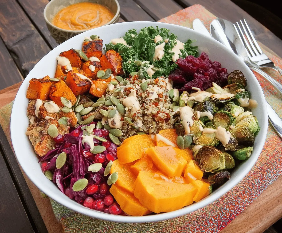 Finally, just before serving, drizzle your creamy tahini dressing over the entire bowl. If you’d like, toss it lightly to mix everything, or keep it pretty for a stunning presentation! Enjoy your nutrient-packed Fall Buddha Bowl Delight!